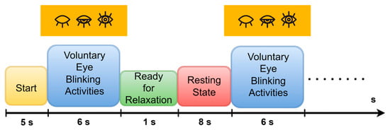 For this experiment, we settled on a single-trial organization consisting of multiple voluntary eye-blinking movements. The participants followed the experimental instructions on a monitor (17” LCD). These instructions are represented in Figure 4. Each experimental trial included different phases; starting point fixation, voluntary eye blinking movements, ready for relaxation, and resting state.