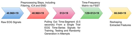 Time segments and training size are important critical parameters to provide better biosignal-based biometric systems [38]. The FSST conducted the feature extraction process (see Figure 5). The relevant time segment is defined as 0.5 s over the single-trial EOG sequential time series for the training, testing, and attempts on the ensembled RNN models. Biosignal-based biometrics does not describe the optimal time segment length. Nevertheless, increased time segments are noted that this change only achieves better performances significantly. Furthermore, increased training size can achieve higher biometric system performances, as in the reported works [39]. In our study, an 80–20% rate of data splitting strategy was employed for the training and testing phases, respectively. According to the literature, this rate is the best and optimal rate for providing higher performance for biosignal-biometric systems constructed on RNN deep models [8].
