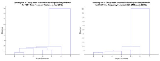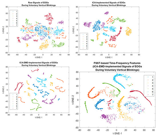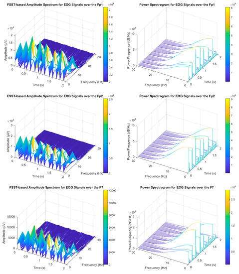 The analysis of non-stationary electrophysiological signals requires high-level time-frequency (TF) methods due to the spectral properties of these time-series signals varying over time [30]. Synchrosqueezing transform is an intended advanced TF strategy based on Continuous Wavelet Transform (CWT) and the Short-Time Fourier Transform (STFT) to concentrate sharpens localization of spectral estimation for the oscillation components of a signal. The synchrosqueezing process reassigns “condenses” time-frequency maps around the curves of the instantaneous frequency changes [30]. Hence, FSST is capable of concentrating energy coefficients to obtain compact TF distribution covering TF-based feature extraction vectors. Thus, it may enable high accuracy rates for EOG-based biometric authentication tasks (see Figure 7). STFT determines Fourier transforms while moving along the signal from start to end with a fixed-length window function [30,31]. The related mathematical relations were represented in the following equations. Where and are defined for the round and real part operations, respectively.