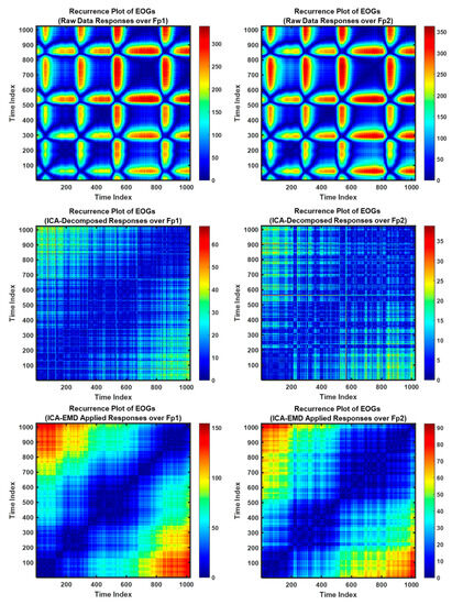 Recurrence plot (RP) is a recent analysis technique for nonlinear and dynamic activity of biological signals. This method can focus on the repeating patterns of the time-series signals over states and can define geometric structures to visualize the recurrent occurrences of states as a phase space [44]. In this research, RP was employed to visualize the decomposition success over the sequential channels (Fp1–Fp2) for the raw EOG signals and decomposed responses via ICA and EMD (see Figure 8). Long vertical line is able to describe responses, occurred the same state during some time steps [45]. Here, the related segments of this case for signals mean staying in the same phase space region for a short while, and it can be dominated by slow (theta or alpha) waves, including EOGs (8–15 Hz). Thus, high-frequency components can vanish, and slow waves are shown as longer times leading to the up-slope/down-slope patterns [45].