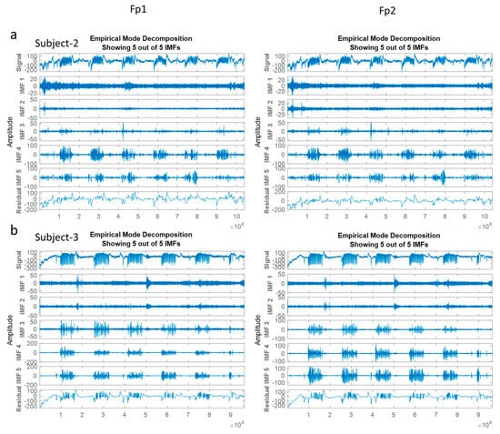 The Empirical Mode Decomposition algorithm is considered an adaptive and data-dependent technique to decompose non-linear and non-stationary signals into a set of amplitude-modulated and frequency-modulated components called Intrinsic Mode Functions (IMFs) [14]. This separating analysis way is a powerful time–frequency analysis technique expressing the internal modes’ instantaneous frequency. IMFs include relevant and instant frequency information to obtain frequency values that change over time to offer better time resolution compared to ones. Thus, EMD is to facilitate EOG isolation from EEG signals/ and it is employed voluntary eye blinks extraction from the scalp-recorded EEGs in EOG-based biometric authentication [14,41].