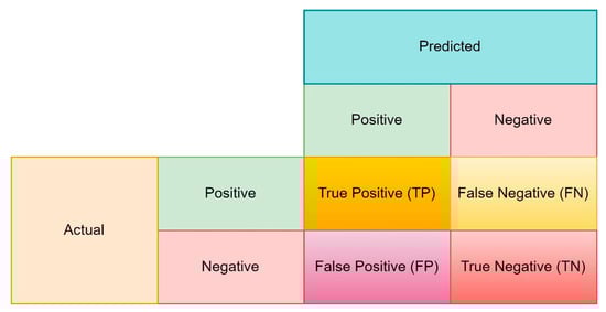 The performance metrics are reported as a key to evaluating machine learning models in pattern recognition tasks and finding the optimal method for solving a problem. The selection of appropriate metrics is critical in data science [48]. A confusion matrix (see Figure 11) is employed to create the other metrics frequently from the fundamental metrics (true positive/TP, true negative/TN, false positive/FP, false negative/FN).