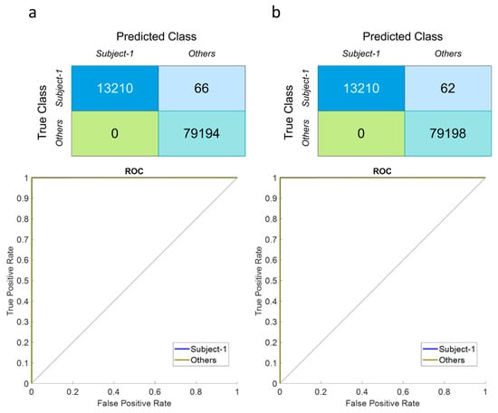 Table 4 highlights the prediction performances of seven participants in the proposed one-versus-others EOG-biometric authentication scheme for isolated EOG signals generated by voluntary eye blinkings. According to the results, Subject-7 has achieved high classification performances for all metrics (ACC: 99.99%, SENS: 99.95%, SPEC: 100%, PREC: 99.99%, F-score: 99.95%, AUC: 0.999 and ITR: 0.931) among the others. The worst biometric classification discrimination was calculated on Subject-5 (ACC > 89%, AUC > 0.7, and ITR > 0.9 score). The framework attained the second highest classification performances provided over the Subject-4 (ACC: 99.93% and AUC: 0.997), Subject-1 (ACC: 99.92% and AUC: 0.997), and Subject-3 (ACC: 99.91% and AUC: 0.996), respectively. These biometric prediction results have depicted the number of four individuals reaching up to the >99% (ACC, SENS, SPEC, PREC, and F-score) discrimination regarding the observation metrics. Moreover, the average of these persons’ outcomes has been obtained over >96% accuracy, >0.9 AUC score, and >0.9 ITR value.