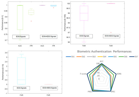 In order to calculate the robustness of the biometric authentication systems, the ‘True Acceptance Rate’ (TAR) and ‘False Acceptance Rate’ (FAR) are implemented in the developed biometric approaches. Observation of the quality of specific attempts (genuine or forgery) is carried out to take into account verifying a true identity claim (TAR) and the percentage of unauthorized users (FAR) [40]. The expected and successful biometric system is designed to maximize the TAR score while minimizing the FAR score during multiple times of attempts. In this EOG-based biometric approach, 100 attempts were conducted to obtain TAR and FAR scores. Thus, the decision for calculating the TAR and FAR scores was provided after the matching and thresholding process according to the relevant formulas:
