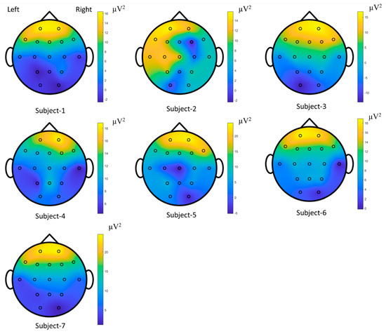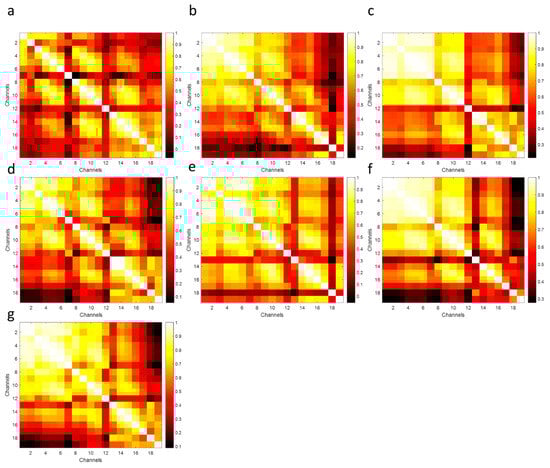 The time-series EOGs responses occur in frequency falling in the range of 0.5–15 Hz/20 Hz and have dynamic and nonstatic characteristics acquired by the origin of the voluntary eye blinkings [14,64]. The channel positions on the scalp were estimated to explore the performances of the raw EOG signals in the FSST-ICA-EMD framework-based biometric authentication. A minimal subset of recorded channels is targeted for low computational cost and portability of the equipment in biometric systems [3,40]. These responses correspond to the seven subjects and represent the brain mappings of the unique pattern for each person. The power spectral density outcomes for 15 Hz were plotted to address the temporal-spatial patterns. According to these mappings (see Figure 19 [65]) and functional connectivity (see Figure 20), frontal (high level) and posterior parietal (low level) cortices reveal the action-specific sites during eye blinking activations.