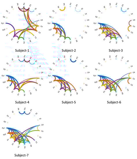 Furthermore, Circular Graphs (CGs) were described to calculate the correlation of scalp locations introducing the dynamics of functional connectivity across multiple channels [66,67]. Visualization functionality during voluntary eye blinkings for the biometric systems is important to observe nonlinear connectivity in every EOG recording. The connectivity values between channels were handled to draw the lines connecting the two channels. The drawn width on the circumference of the circle is to represent the correlation strength of the connection [68]. The lines were highly connected, clearly marking the frontal-to-other cortices in both hemispheres.