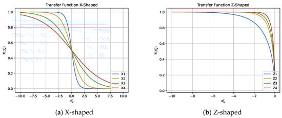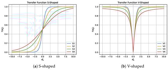 Time-varying S-shaped and V-shaped transfer functions when and during 100 iterations with time step 2 [].