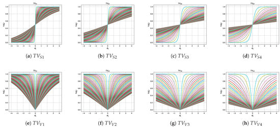 In 1997, Kennedy et al. [] introduced transfer functions in the field of optimization. Their main advantage is that they provide a probability between 0 and 1 with low computational cost. There are several types of transfer functions, including those in the form of an S [,] and a V [], as well as in the forms of O, Z, X, Q, and U, among others. These functions are used to transfer values generated by the continuous MH to a continuous interval between 0 and 1, allowing the quality movements of the continuous MH to be preserved while high-quality binary solutions are generated. The families of transfer functions we have used in this work can be seen in Table 1 and Table 2 and Figure 1 and Figure 2. The notation observed in Table 1 and Table 2 corresponds to the continuous value of the j-th dimension of the w-th individual resulting from the perturbation performed by the continuous metaheuristic.