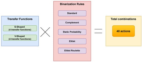 The decision of which action to take is a complex task that requires careful evaluation of multiple options in different situations. In this context, Q-learning is utilized, which is a reinforcement learning technique that seeks to determine the best action to take in a specific state. In this work, as in previous studies, we define the considered actions as the existing combinations between the transfer functions (Table 1 and Table 2) and the binarization rules (Table 4). As an example, Figure 4 shows how the possible 40 actions that Q-learning would choose if it were working only with S- and V-type transfer functions and the five defined binarization rules, would be formed.