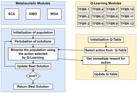 In the literature, various related works have proposed the hybridization of the sine cosine algorithm, grey wolf optimizer, whale optimization algorithm, and Q-learning [,,,]. Q-learning was used as a dynamic binarization scheme selector in each of the metaheuristics, allowing them to solve binary combinatorial problems. This solution delegates the selection of a good binarization scheme to an artificial intelligence, eliminating any human bias.