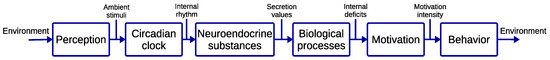 - O’Brien, M.J.; Arkin, R.C. An Artificial Circadian System for a Slow and Persistent Robot. In Proceedings of the International Conference on Simulation of Adaptive Behavior, Frankfurt, Germany, 14–17 August 2018; Springer: Berlin/Heidelberg, Germany, 2018; pp. 149–161. [Google Scholar]