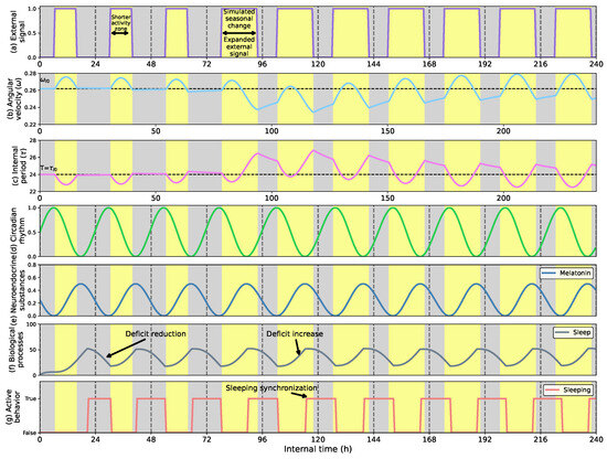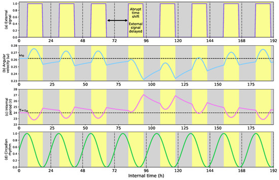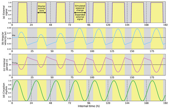 - Show how the circadian clock adapts time and angular velocity to changing environmental conditions. We demonstrate its performance in two cases: abrupt time shifts and seasonal changes in the External signal.