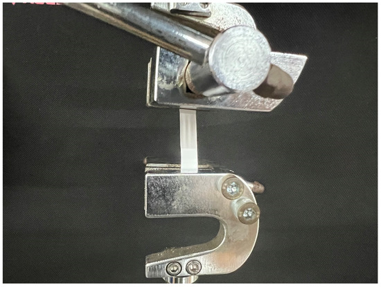 Rectangular samples of 150 mm × 10 mm were cut out of the membranes prepared with various coaxial electrostatic spinning process parameters, and each sample was gripped with jigs at both ends of the material testing machine with a distance of 50 mm between the two ends. Moreover, a preloading force of 0.1 kN was applied, as shown in Figure 2. The sample was then stretched at a speed of 10 mm/min until it broke, reading the data of each stretch. The above test was repeated 5 times for each sample, and the average value was taken as the result.