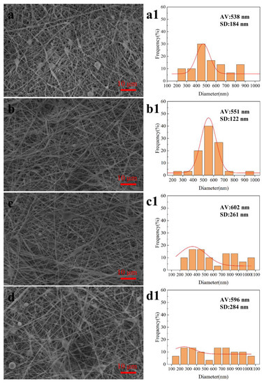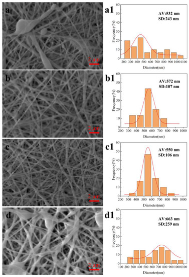 SEM images and fiber diameter distribution of coaxial electrospun membranes prepared with electrospinning voltage. (a,a1) 10 kV; (b,b1) 14 kV; (c,c1) 18 kV; (d,d1) 22 kV.
