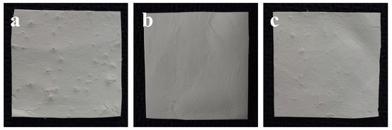 The macroscopic characterization diagram of coaxial electrospun membranes prepared under different key process parameters. (a) A2B1C3D3; (b) A2B2C2D2; (c) A2B3C1D1.