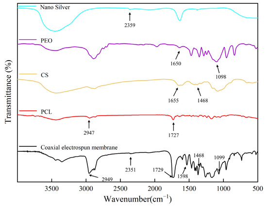 Figure 8 shows the FTIR spectra of each material and the coaxial electrospun membrane. The infrared spectrum of pure PEO shows a peak at 1098 cm−1, which is attributed to the stretching vibration of the ether group (C-O-C) [27]; there is a strong and broad peak at 3459 cm−1 in the infrared spectrum of pure CS, which is related to O-H and N-H stretching bond [13]. In the PCL infrared spectrum, the peak at 2947 cm−1 is for the C-H stretch, and the strong peak at 1727 cm−1 is for the C=O double bond [28]. Thus, the infrared spectrum of the coaxial electrospun membrane shows a characteristic peak at 1099 cm−1, which is related to the C-O-C stretching vibration of PEO, and a peak at 1729 cm−1, which is related to the C=O carbonyl stretching of PCL; the presence of CS in the coaxial electrospun membrane is confirmed by the broad bond centered around 3450 cm−1 due to O-H and N-H stretching and the presence of a characteristic peak at 1468 cm−1 due to the CH2 bending of polysaccharide. The presence of a characteristic peak at 2351 cm−1 confirmed that nano-silver is physically adsorbed [29].
