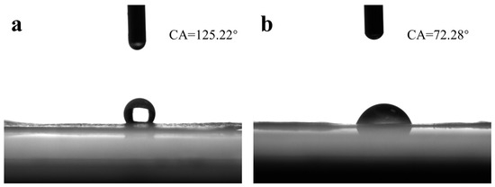 Hydrophilicity is an important index used to evaluate the biocompatibility of the membrane, and it can be judged from the water contact angle [32]. Good hydrophilic film is conducive to cell adhesion and proliferation, but a too-good hydrophilic film will also affect cell migration [33]. As can be seen from Figure 9, the water contact angle of the pure PCL membrane was 125.22°, showing strong hydrophobicity. Due to the good hydrophilicity of CS and PEO, after adding CS and PEO for coaxial electrospinning, the hydrophilicity of the coaxial electrospun membrane was significantly improved, and the water contact angle of the coaxial electrospun membrane was 72.28°. Compared with electrospinning with PCL alone [34], the addition of CS and PEO could effectively improve the hydrophilicity of the membrane.