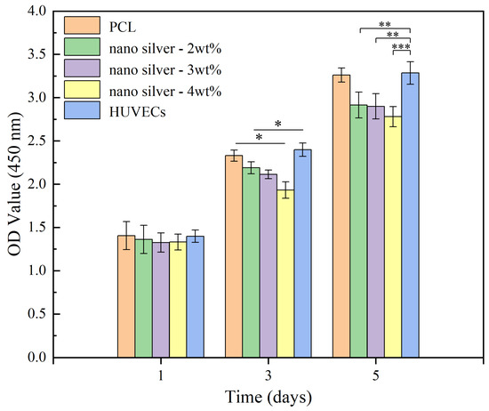 Nano-silver has antibacterial activity, but in high concentrations, it causes toxicity to human cells and even harms human health [35]. As shown in Figure 10, after 1, 3 and 5 days of cultivation, OD values of the four groups increased steadily. At 1 d, there was no statistically significant difference between the four groups. At 3 d, the cell proliferation rate in the PCL membrane group and HUVECs group was faster, and the survival rate of coated cells with a nano-silver content of 4 wt% was lower than that of other groups. The cell survival rate of the PCL membrane group and HUVECs group was still higher than that of nano-silver-containing membrane groups until 5 d, the cell survival rate of the membrane with a nano-silver content of 4 wt% was still lower than that of other groups, and the cell survival rates of the coaxial electrospun membranes with a nano-silver content of 2 wt% and 3 wt% were similar, only slightly lower than HUVECs group. The results showed that the coaxial electrospun membrane with nano-silver had almost no obvious inhibitory effect on HUVECs and only slight cytotoxicity when the content of nano-silver was increased to 4 wt%.