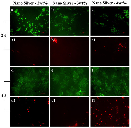 Cell life/death patterns of coaxial electrospun membrane containing different concentrations of nano-silver. (a,a1,d,d1) 2 wt%; (b,b1,e,e1) 3 wt%; (c,c1,f,f1) 4 wt%.