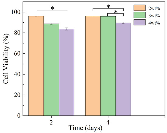 Cell viability of coaxial electrospun membrane containing different concentrations (2 wt%, 3 wt% and 4 wt%) of nano-silver (* p < 0.05, n = 3).