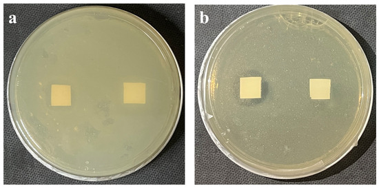 In this experiment, the inhibitory activity of the coaxial electrospun membrane against E. coli (representative of Gram-negative bacteria) and S. aureus (representative of gram-positive bacteria) was tested in vitro. First, the coaxial electrospun membrane containing nano-silver was cut into a sample size of 1 cm × 1 cm, and the PCL membrane without nano-silver was also cut into a sample size of 1 cm × 1 cm. Secondly, the coaxial electrospun membranes were placed at the bottom of each culture dish in the super clean table, a PCL membrane was also placed as a control group, and then the surface was evenly coated with 30 µL of E. coli or 30 µL of S. aureus, sealed with a sealing strip and stored in a 37 °C incubator. The inhibition area was observed at 72 h.