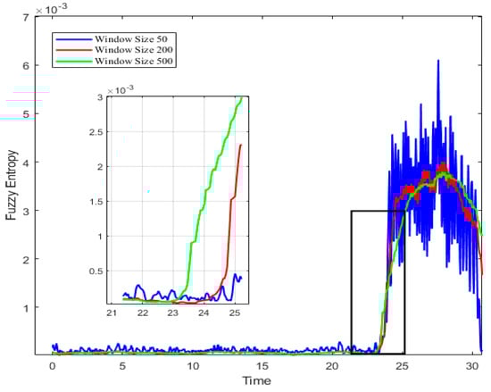 In the fuzzy entropy algorithm, the embedding dimension m is set to be 2, and the similarity tolerance r is equal to , where represents the standard deviation of the window data . The variations of fuzzy entropy are indicated in Figure 2, with different window widths at 2500 rpm. According to the suggestion on the parameter selection [25], the sliding step size of 20 and the sliding window size of 200 are chosen here to minimize noise interference and enhance the significance detection. Appropriate parameters can contribute to analyzing the spatial pattern for the inception recognition. And it can quantitatively distinguish the property at the instability boundary of the system, as the square marked in the chart.