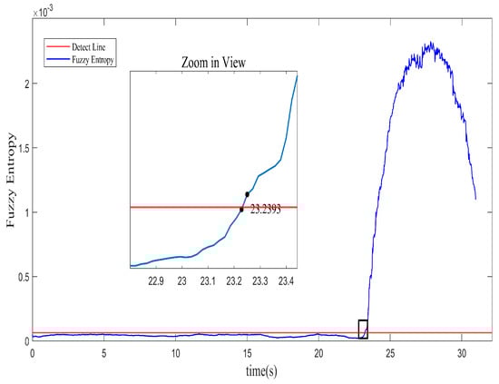 where the standard deviation is represented as , and the mean entropy value in stable conditions is represented as . If the fuzzy entropy value deviates from the threshold set for recognition, this location is marked as a detection point for system instability. In the normal operating condition, the first-order spatial mode remains relatively stable with small fluctuations. And the changes in fuzzy entropy are minimal, indicating a simple and regular system with low uncertainty. As pointed at the intersection of the detection line and the fuzzy entropy in Figure 3, the inception of system instability labels at approximately 23.2393 s, correspond to 968.3 revolutions. It means that the instability inception of the system can be recognized about 30.35 revolutions in advance using the identification strategy with the fuzzy entropy algorithm.