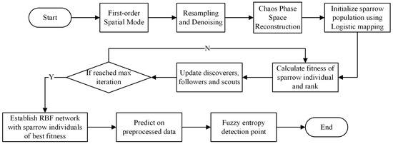 The optimized RBFNN-LSSA model is employed for the system status prediction subsequently. And the generalization ability is estimated with the test sample data. The predicted result served as a precursor for the instability of the compressor. Furthermore, the stall inception of the compressor is monitored with the fuzzy entropy as the detection strategy. Fuzzy entropy is capable of assessing the complexity and uncertainty of data sequences. The significant variation in fuzzy entropy indicates the index as the occurrence of compressor instability. The modeling process of the RBFNN-LSSA hybrid model is illustrated in Figure 4.