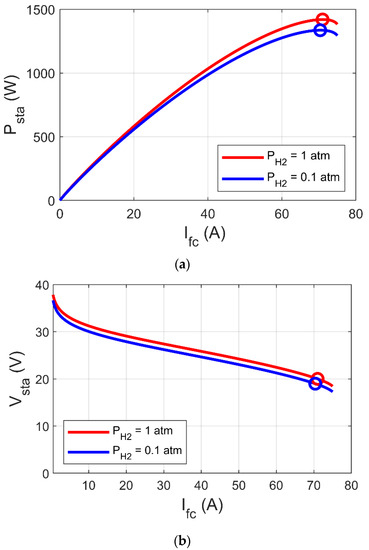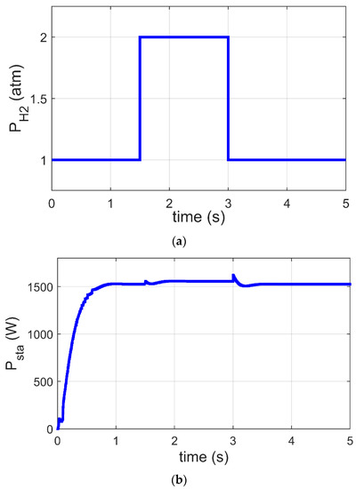 In this subsection, the GJOA-PI-PD controller for MPPT of the Ballard Mark V PEM-FC is validated when changes. Figure 11a reveals that the value of is initially 1 atm, then it increases to 2 atm at and afterward it decreases to 1 atm at . Figure 11b reveals the corresponding response of Psta during a change in where we observe that MPPT based on the GJOA-PI-PD controller reacts speedily to variation in . During the period of increase of , Psta increases to new value then decreases with decrease of . This means that Psta tracks the new MPP for new conditions. The new conditions in this case study resulted in a variation of from 1 atm to 2 atm and then from 2 atm to 1 atm, with constant values of and . Additionally, the absence of oscillations is observed. Furthermore, the values of overshoot and undershoot are very small.