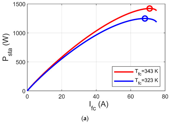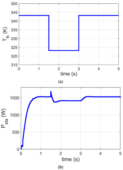 This part presents a justification for the GJOA-PI-PD controller for MPPT of the Ballard Mark V PEM-FC when varies. The change in is revealed in Figure 12a, where it is initially 343 K, then it decreases to 323 K at and after that it increases to 343 K at . The corresponding response of Psta during variation of is illustrated in Figure 12b, where the quick performance of MPPT based on the GJOA-PI-PD controller with variation of is observed. Throughout the period of decrease in , Psta decreases to its new value then increases with increase in . This indicates that Psta tracks new MPP for new conditions. The new conditions in this case study are caused by change in from 343 K to 323 K and then from 323 K to 343 K, with constant values of and . Moreover, there are no high values for oscillations during variation in Psta.