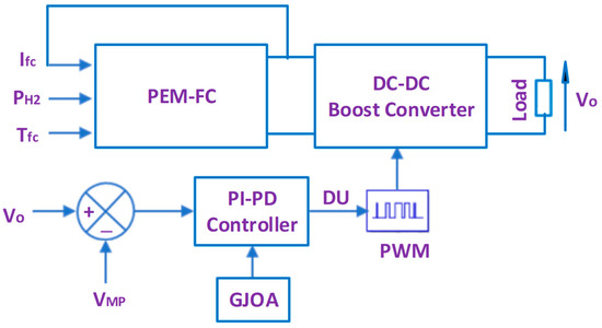 Figure 5 reveals the schematic diagram of the suggested control scheme for MPPT of the PEM-FC, where DU of the DC-DC boost converter is tuned using a PI-PD controller whose gains are tuned using GJOA. The input of the PI-PD controller is the difference between VMP and Vo in order to make Vo track VMP continuously, and then tracks MPP continuously. The details of the PI-PD controller, GJOA, and fitness function (FiFu) of the GJOA are illustrated in Section 5.1, Section 5.2 and Section 5.3, respectively. Afterwards the compared approaches, i.e., FOPID controller and P&O, are illustrated in Section 5.4 and Section 5.5, respectively.