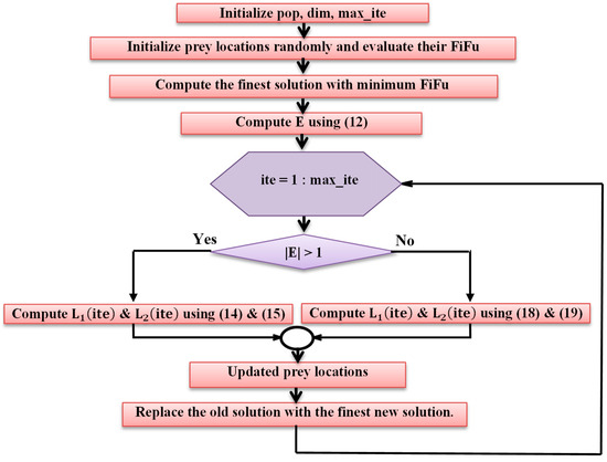 where and indicate the diminishing energy of the prey and the initial energy, respectively. Value of ranges from [−1, 1], while the value of is computed via (13) [52].