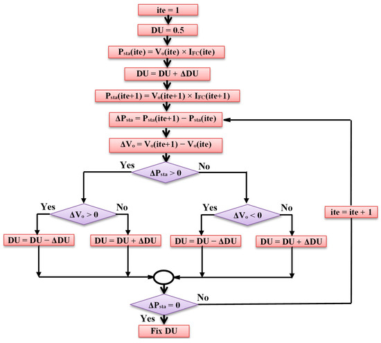 P&O is an iterative approach for MPPT of PEM-FC. P&O is commonly utilized for its simplicity. Firstly, Vo and IFC are measured and Psta is calculated via multiplying their values, then DU is changed by fixed ΔDU, which leads to a change in Vo and, accordingly, Psta. The resultant changes in Psta (ΔPsta) and Vo (ΔVo) are monitored. If ΔPsta and ΔVo have the same sign, then DU is decreased by ΔDU, otherwise DU is increased by ΔDU in the next iteration. This procedure is repeated until ΔPsta equals zero, i.e., it reaches MPP. Figure 8 reveals the flow chart of the P&O approach [13].