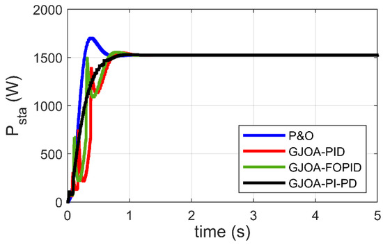 Figure 10 reveals Psta of the Ballard Mark V PEM-FC when three MPPT schemes, plus the proposed scheme, are applied. Specifically, the P&O approach, GJOA-PID, and GJOA-FOPID controllers are compared with the proposed GJOA-PI-PD controller. High overshoot exists in the response of Psta when the P&O scheme is employed. There are oscillations and slowness in the response of Psta when GJOA-PID, and GJOA-FOPID controllers are employed. The resultant values of rise time (tr) and percentage overshoot (POS) for various MPPT schemes are listed in Table 9. The proposed GJOA-PI-PD controller results in POS of 0.2% which is the lowest overshoot compared to other MPPT schemes i.e., the P&O approach, GJOA-PID, and GJOA-FOPID controllers, by 98.26%, 86.30%, and 89.07%, respectively. The resultant value of tr with the proposed GJOA-PI-PD controller is 0.391 s, which is less than that of the GJOA-PID, and GJOA-FOPID controllers but more than that of P&O. The criteria in comparison are that the MPPT scheme, which has the quickest response, the least oscillations, and the lowest overshoot, is preferred over other schemes. When these criteria are applied to the results revealed in Table 8, the proposed GJOA-PI-PD controller is found to have better equilibrium among speed and overshoot than other MPPT schemes.