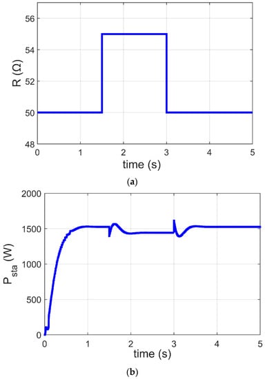In this subsection, the GJOA-PI-PD controller for MPPT of the Ballard Mark V PEM-FC is justified when changes. Figure 13a reveals that the value of is initially 50 Ω, then it increases to 55 Ω at and afterward decreases to 50 Ω at . Figure 13b reveals the corresponding response of Psta during change in where MPPT based on the GJOA-PI-PD controller responds quickly to variation in . During the period of increase in , Psta decreases to its new value then increases with decrease of . This points out that Psta tracks new MPP for new conditions. The new conditions in this case study result in variation of from 50 Ω to 55 Ω and then from 55 Ω to 50 Ω, with constant values of and . In addition, the oscillations are low.