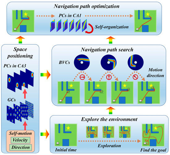 This subsection provides a detailed introduction to the navigation path search and optimization method based on the rat brain’s cognitive mechanism. It consists of four main components: spatial localization, environment exploration, navigation path search, and navigation path optimization. Firstly, the robot is allowed to explore the environment freely in order to find the navigation goal. Once the robot discovers the navigation goal, the greedy strategy is employed to search for the navigation path. In this stage, boundary vector cells play a crucial role in recognizing the environment boundaries and obstacles. Finally, the dynamic self-organizing computational model of hippocampal CA1 place cells is used to optimize the navigation path. This model can adaptively adjust the navigation path based on the environmental structure. Spatial localization serves as the foundation for the entire process. Grid cells and hippocampal CA3 place cells integrate self-motion cues to obtain the robot’s position information within the environment [30]. The overall operational mechanism of the method is illustrated in Figure 1.