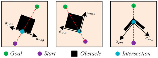 The set of boundary positions is defined as , and the set of all previously visited locations by the robot is denoted as . Let represent the next moment position of the robot when it moves in the direction . Next, we classify and discuss the different cases for the values of . Since both the starting point and the target are within the environment, the robot moving along the direction will never collide with obstacles. Therefore, the statement always holds. When , it means that the robot can move along the direction without colliding with obstacles. According to the greedy strategy, in this case, the robot will directly choose as its movement direction. On the other hand, when , it implies that the robot will collide with an obstacle if it moves along the direction . In this situation, the mathematical expression for calculating is as follows:
