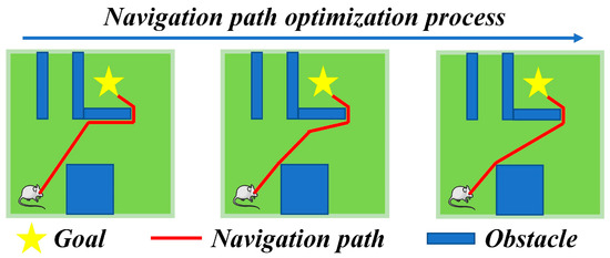 However, the navigation paths obtained from the greedy strategy tend to be more curved and further optimization is required. After the hippocampal CA1 place cells store the navigation paths, they can adaptively adjust the paths based on the environmental structure. This adjustment is achieved through the self-organizing mechanism of the place cells. Let the i-th place cell be denoted as , where represents the center coordinates of the firing field. represents the orientation angle of the agent at , initially set as the angle between the line connecting the firing field centers of adjacent place cells and and the positive x-axis. The update in the position of the i-th place cell’s firing field center at time is denoted as , and the correction to the orientation angle is denoted as . The relevant mathematical expressions are as follows: