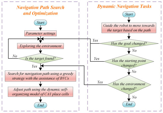 The path planning and navigation of mobile robots have been widely studied, and classic path planning methods mainly include the A * algorithm [19], the Rolling-Window RRT algorithm [20], etc. However, these types of algorithms have a strong dependence on heuristic functions and parameter selection, and do not have good adaptability to dynamic navigation tasks. In recent years, research on spatial navigation methods based on biomimetic cognitive mechanisms has gained increasing attention from researchers, primarily in two research directions. The first direction is biomimetic environment map construction and navigation. This research aims to construct environmental cognitive maps based on the operating principles of the rat brain and then perform path planning and navigation based on cognitive maps. Yu et al. simulated the computational models of four types of spatial cells in the entorhinal-hippocampal structure using a unified computational mechanism, enabling the construction of environmental cognitive maps and navigation based on these models [21]. Liu et al. proposed a self-organizing learning framework based on episodic memory for robot experiential learning, cognitive map construction, and navigation [22]. However, although map-based path planning and navigation methods are widely used in practical applications, they often tend to be more engineering-oriented and lack biomimetic fidelity to the real navigation abilities of biological systems.