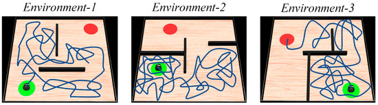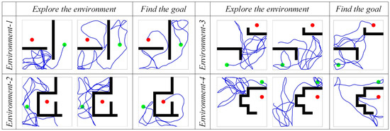 First, the agent is allowed to explore the environment and search for the navigation goal. The maximum path length for a single exploration process is set to 80 m. The motion trajectories of the agent in the spatial regions are shown in Figure 5. The sequence from left to right represents the increasing number of exploration attempts. The green and red circles represent the starting and ending points of navigation, respectively. The black rectangles represent obstacles, and the blue lines represent the movement paths of the agent in the spatial regions. It can be observed that as the agent moves continuously, its trajectory covers the entire spatial environment. When the robot reaches the navigation goal, it records its own position as the position of the navigation goal.