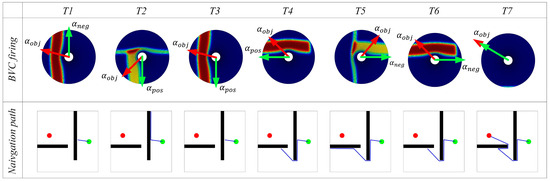 The red arrow in Figure 6 represents the direction, and the green arrow represents the next movement direction given by the path search algorithm. Time T1 and T4 represent the moments when the agent first encounters an obstacle. The direction with the smallest angle difference with from and is selected as the next movement direction. In the subsequent movement process, if the agent detects the boundary of the environment, it returns along the same path, as shown in time T2 and T5 in Figure 6. Then, in time T3 and T6, the agent returns to the position where it first encountered the obstacle, selects the other direction from and as the next movement direction, and continues to search for the navigation path. If the boundary vector cell does not perceive any obstacles in the movement direction, the agent directly selects as the next movement direction, as shown in time T7 in Figure 6. The path search is then performed in environments 2, 3, and 4, with the results shown in Figure 7. The experimental results demonstrate that the proposed method can accurately search for the navigation path.