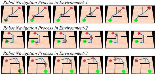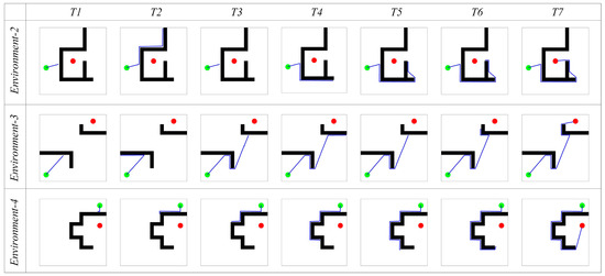 Experimental results of path searching process of the agent in environment 2, 3, and 4. In the figures, the green circle represents the navigation starting point, the red circle represents the navigation endpoint, the black wall represents the obstacle, the blue line represents the robot’s navigation path, and the columns represent successive time points during the simulation.