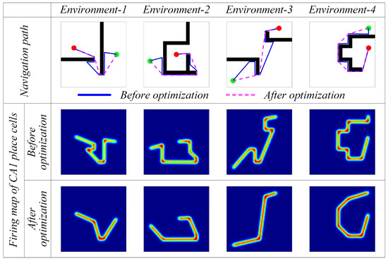However, from Figure 6 and Figure 7, it can be observed that the navigation paths obtained by the greedy strategy are somewhat curved and may not be optimal. Therefore, further optimization is needed using the hippocampal CA1 place cells’ self-organizing model. Figure 8 shows the results before and after navigation path optimization. The first row represents the comparison of the paths before and after optimization, where the blue lines represent the original paths and the pink dashed lines represent the optimized navigation paths. The second row represents the firing rate map of the CA1 place cells before path optimization, where brighter colors indicate a stronger firing activity of the CA1 place cells in that area. The third row represents the firing rate map of the CA1 place cells after path optimization.