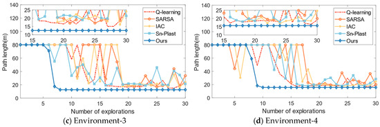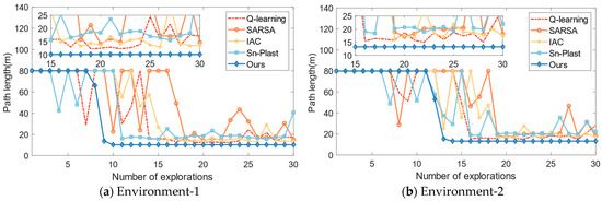 Then, in order to further highlight the advantages, it is compared with several navigation habit development algorithms, such as the Q-learning algorithm [25], the SARSA algorithm [33], the Sn-Plast algorithm [28], and the Intelligent Curiosity Algorithm (IAC) [23]. These algorithms are all reinforcement learning algorithms that can guide the agent to explore the spatial environment and develop navigation habits. The number of explorations in a single navigation habit formation process is set to 30, and the maximum path length for a single exploration process is set to 80 m. The variation of path length with the number of explorations is shown in Figure 10.
