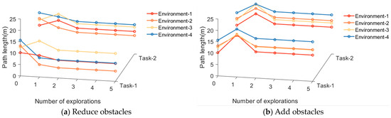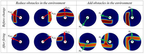 The adaptability of the model to dynamic changes in navigation tasks is verified by adding or removing obstacles on the original navigation path and changing the starting and ending points of the navigation task. The behavior of the algorithm in response to environmental changes and changes in navigation tasks is observed. The changes in obstacles in the environment are primarily perceived through the boundary vector cell. When the agent moves along the navigation path, if obstacles are detected in the direction , the boundary vector cell indicates that obstacles have been added to the environment and the agent needs to detour. If no obstacles are detected in the direction , the boundary vector cell indicates that obstacles have been removed from the environment. The firing effects of the boundary vector cell sensing the changes in obstacles are shown in Figure 11. The adjustment effect of navigation paths in dynamic navigation tasks is shown in Figure 12, and the change in path length with exploration iterations is shown in Figure 13.