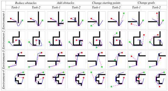 The adjustment effect of navigation paths in dynamic navigation tasks. In the figures, the green circle represents the navigation starting point, the red circle represents the navigation endpoint, the black wall represents the obstacle, the blue line represents the robot’s original navigation path, and the pink dashed line represents the robot’s new navigation path.