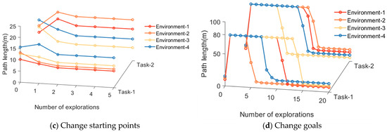 In Equation (29), represents the number of times the navigation goal is discovered, and represents the number of times the navigation goal is discovered and the agent is able to navigate to the goal in the subsequent three exploration tasks. The average length of navigation paths, denoted as , represents the average value of the exploration path lengths for all the times the navigation goal is discovered, and it is mathematically expressed as follows: