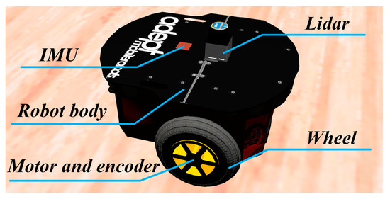 To further validate the effectiveness of the method, navigation experiments were conducted using a robot platform in the Webots simulation environment. The robot platform in the Webots simulation environment is illustrated in Figure 14. The Pioneer-3DX robot was used as the experimental platform. This robot has omnidirectional mobility and uses a wheeled chassis and electric drive system for motion control. Additionally, the robot is equipped with various sensors, including a lidar for detecting obstacles and boundaries of the environment, an IMU for obtaining the robot’s orientation information, and encoders for measuring the robot’s linear velocity during motion.