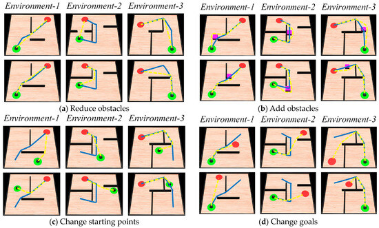 Motion process of the robot completing dynamic navigation tasks. In the figures, the green circle represents the navigation starting point, the red circle represents the navigation endpoint, the black wall represents the obstacle, the blue line represents the robot’s original navigation path, the yellow dashed line represents the new navigation path, and the pink cube represents new obstacles.
