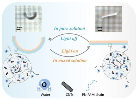 - Hu, Y.; Liu, J.; Chang, L.; Yang, L.; Xu, A.; Qi, K.; Lu, P.; Wu, G.; Chen, W.; Wu, Y. Electrically and Sunlight-Driven Actuator with Versatile Biomimetic Motions Based on Rolled Carbon Nanotube Bilayer Composite. Adv. Funct. Mater. 2017, 27, 1704388. [Google Scholar] [CrossRef]